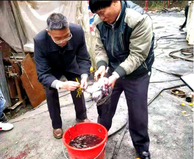 [图为广西建业公司董事长陈业和用钻出高温度的温泉水顺利地给刚宰的土鸡拔毛。]