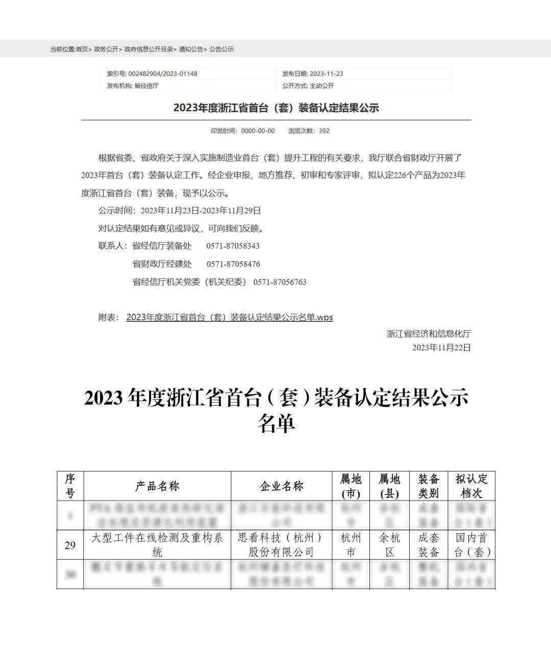思看科技“大型工件在线检测及重构系统”被认定为首台(套)装备。首台(套)装备认定由浙江省经济和信息化厅联合省财政厅开展,是指经过创新,其品种、规格或技术参数等有重大突破,具有知识产权的首台套或首批次的装备产品,包括成套设备、整机设备及核心部件、控制系统、基础材料、软件系统等。