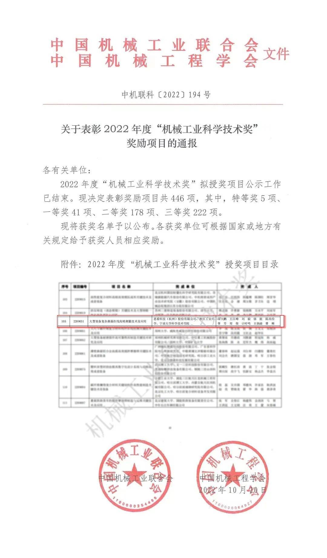 中国机械工业科学技术奖是由中国机械工业联合会和中国机械工程学会共同设立,经国家科学技术部批准,国家科学技术奖励工作办公室认定,面向全国机械行业的综合性奖项,是目前我国在机械行业中唯一由国家批准的奖项。本奖项充分突出了思看科技坚持自主研发、科技创新的价值理念和深植行业的技术积淀。