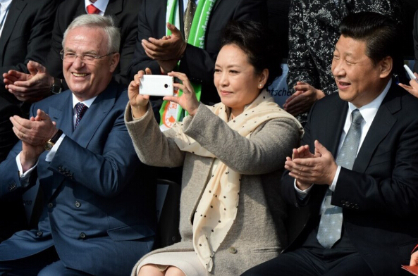 图:2015年3月,在德国观看少年足球队比赛时,彭丽媛拿出中兴旗下的子品牌nubiaz5mini手机拍照/资料图片