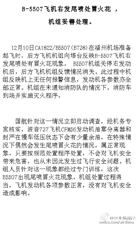 @福州机场:2015年12月10日8时左右,国航CA1822航班在福州机场准备起飞时右发动机冒火,福州机场各相关单位第一时间紧急出动,事件已成功处置,无人员伤亡,旅客均得到妥善安置,陆续办理航班签转工作。受此事件影响,数个航班出现短时间延误,经机场各方通力合作,福州机场航班已于9:38恢复正常起降。该航班执行航线为福州-北京,机型738,飞机计划07 时 45 分从福州机场起飞,10时35分抵达首都机场。