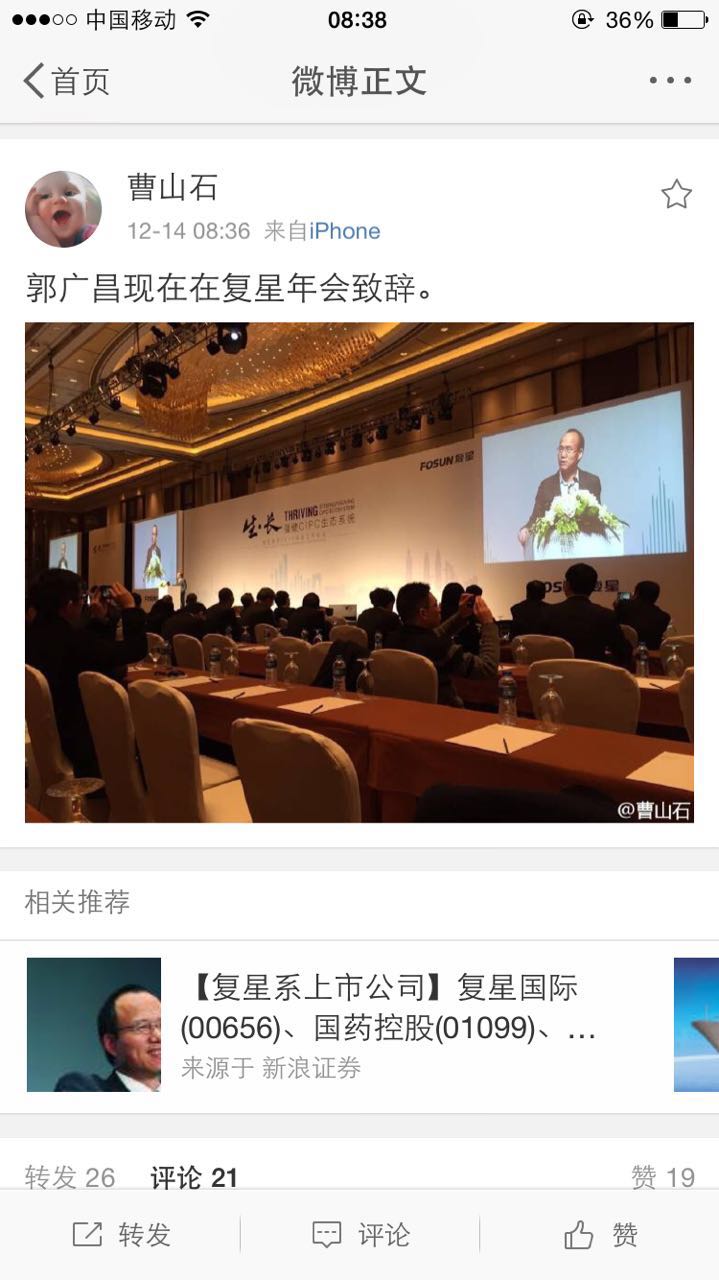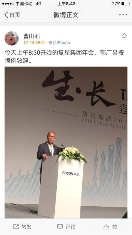 大公财经12月14日北京报道 今天早晨有网友在微博上贴出照片,称复星集团董事长郭广昌出席今天早晨八点半开始的复星集团年会,并按惯例致辞。大公网记者从多个渠道证实了这个消息。