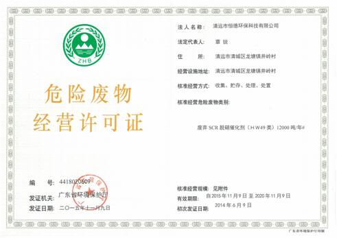 中电恒德在几年前就对工业烟气SCR 脱硝催化剂的再生和处置进行了大量的基础研究,2014年,在环保部刚刚发布《关于加强废烟气脱硝催化剂监管工作的通知》,活动!明确提出将废烟气脱硝催化剂纳入危险废物进行管理之后,中电恒德旗下清远恒德公司就率先在全国获得了第一张HW49类烟气SCR脱硝催化剂再生和处置的一年期临时《危险废物经营许可证》。