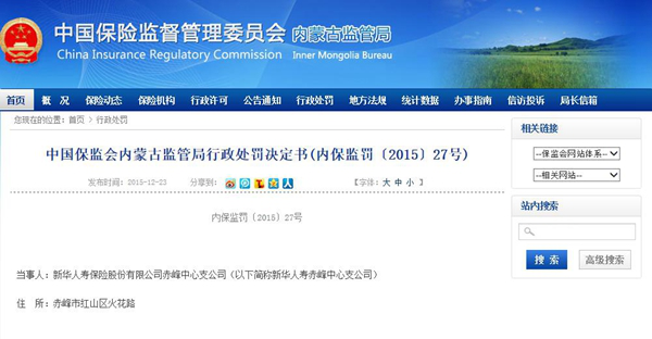 与此同期,新华保险也接连吃监管罚单。2015年年末,品牌策划。新华保险因客户保单信息缺失、有误被湖南保监局责令停止新业务3个月。3天之后,内蒙古保监局对新华保险给予行政触发,因其呼和浩特中心支公司员工帮销保险产品的过程中,多次使用保本保息等夸大、虚假万能险产品。2016年2月27日,新华保险湖北分公司因欺骗投保人,对消费者进行销售误导等问题被湖北保监局处罚,累积罚款金额10万元。3月8日,新华保险甘肃分公司因未建立严格内部控制制度被罚。