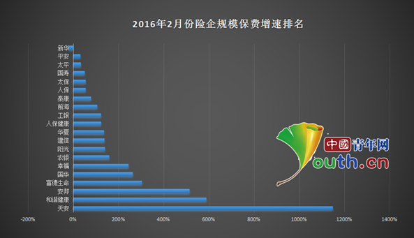 2016年1-2月的保险市场属于中型企业。保监会统计数据显示,人身险公司中,安邦、富德生命人寿、和谐健康、前海人寿等涨幅均超过100%,安邦人寿、和谐健康的增速超500%。在市场前二十位中,新华保险成唯一负增长险企,2月份实现规模保费344亿元,被挤出行业前十。