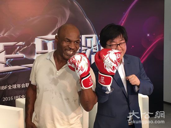 拳王泰森与乐视体育首席运营官于航。/大公报记者 孙琳 摄