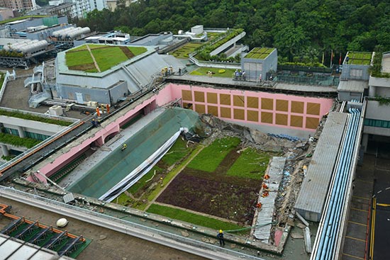 图:城大胡法光运动中心绿化屋顶上月倒塌,校方拟追究承建商\资料图片