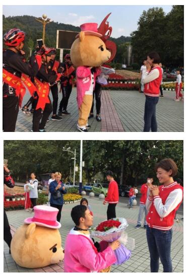 据微博@遵义新鲜事发布讯息,前两日在遵义凤凰楼下惊现求婚现场,有一痴情男子“千里走单骑”,率领众兄弟组成风火轮式的自行车队,来到遵义向女友求婚。并且还颇具心思地变装成网红轻松熊,捧上玫瑰钻戒,让姑娘惊喜交加,不迭点头,当场小伙子的求婚成功。