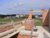 可见,上部,屋面的构造情况;下部,基础的外侧以及砌块墙体的墙根位置,已经粘贴围护白色的EPS聚苯乙烯泡沫保温板。屋面构造层次,从外到内,从上到下,一般为:瓦片+挂瓦木搁条+顺水木搁条+透潮防水专用薄膜卷材+木结构屋架的框架+框架之间,填充无机物材质的不燃型玻璃纤维保温毡毯+专用透潮薄膜封堵+木搁条+防火型石膏板饰面+室内墙面粉刷。