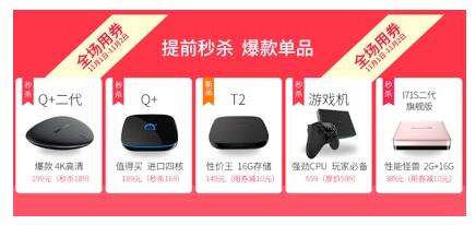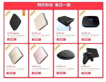 秒杀季,每日单品限量秒杀,低至99元!11月3日—11月9日期间创维官方旗舰店每日一款爆款盒子冰点价秒杀。如果错过了前面的网络数码类大促,那么你现在依然有第二次机会,提前收藏你看中的盒子,然后到对应的日期下单付款即可。另外,在这段期间,前面抽奖的奖品依然可以凭订单号进行兑换,只是之前发的优惠券不能使用了。