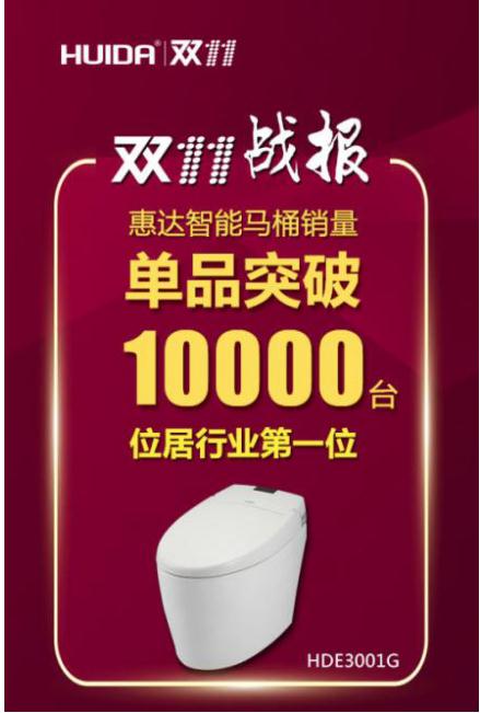 2016年天猫双11数据出炉,惠达卫浴取得了在天猫销额同期增幅激增高达1000%的惊人业绩,浴室柜、浴缸等品类销量居行业第一,更令业界艳羡的是,其智能马桶HDE3001G销量单品突破10000台,居行业第一位。