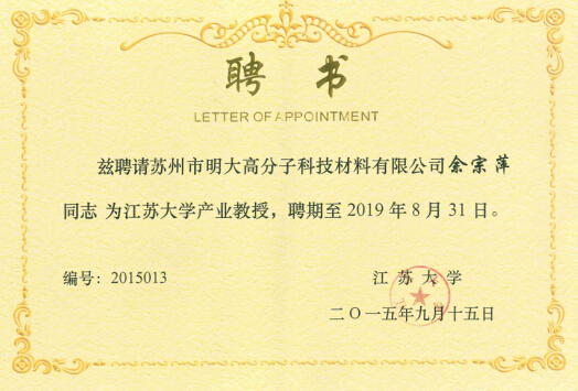 江苏大学兹聘请苏州市明大高分子科技材料有限公司余宗萍同志为江苏产业教授,聘请至2019年8月31日,这份受聘书,不仅赋予了余宗萍盛誉万丈,更是对苏州明大科技最大的肯定,对未来明大科技的研发有极大的鼓舞作用!