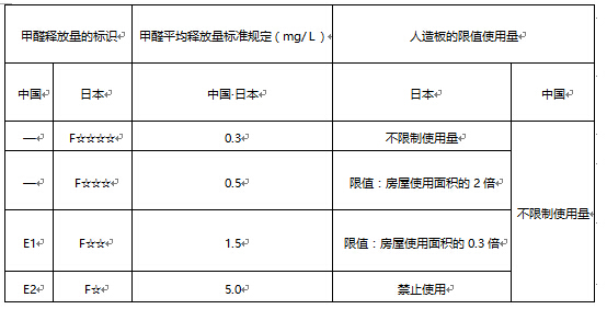 拿最高标准E1来说,我国人造板最高标准E1级板材的甲醛释放量是日本最高标准F板材的5倍,仅相当于日本的F级板材。详见下表。