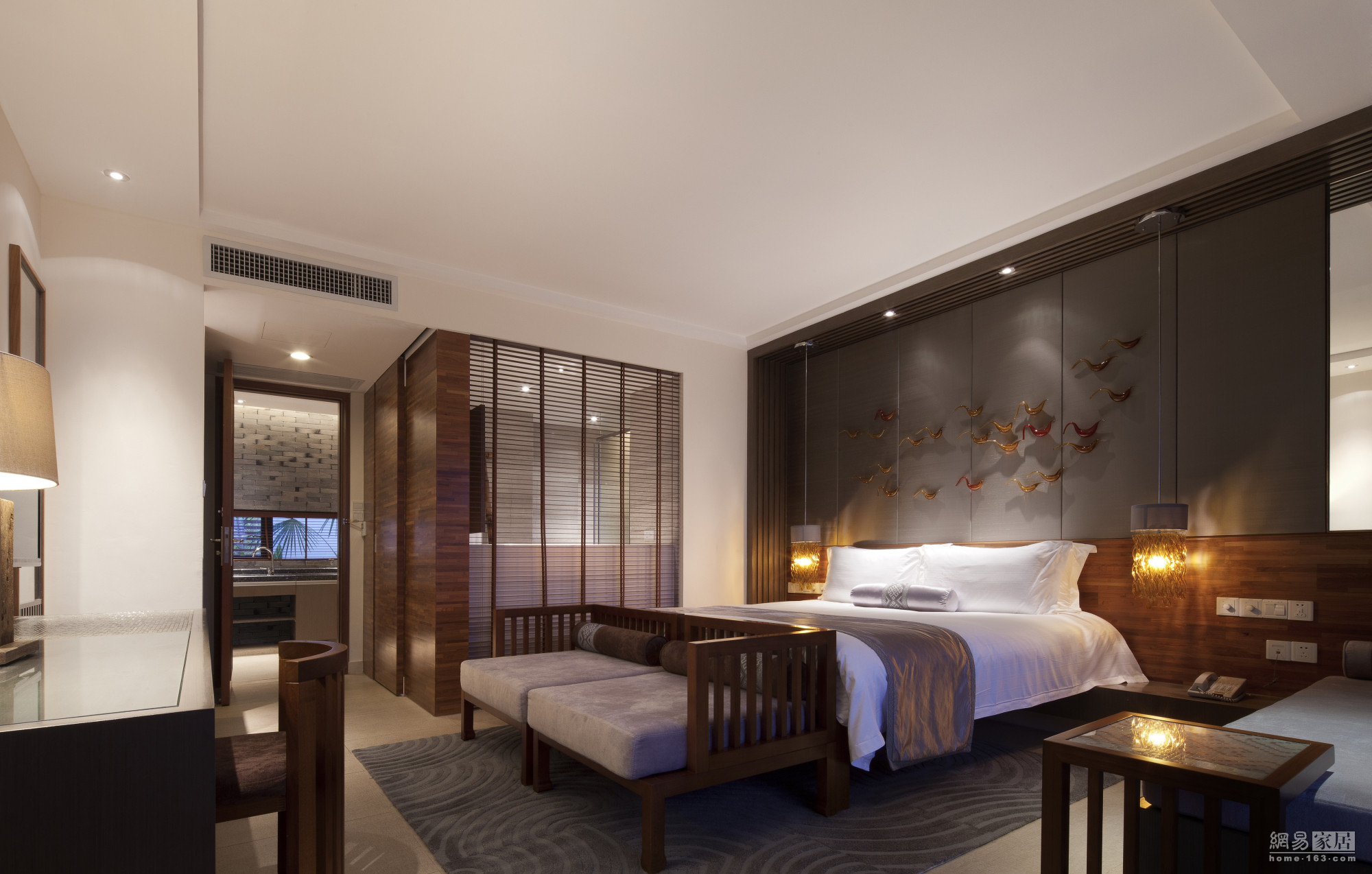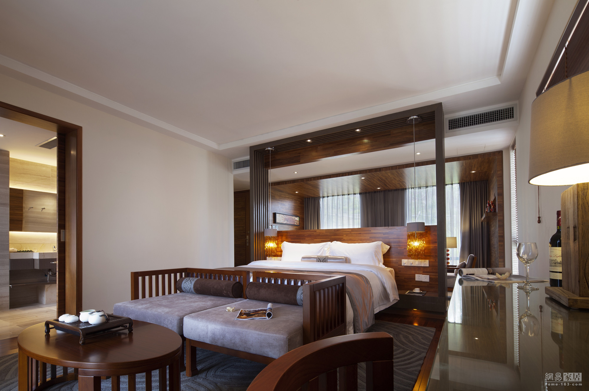 当地的“团云”、“奇木”、“秀水”等自然景观被设计师以抽象的形式剥离,并运用不同的处理手法自然沁透于酒店不同的室内外空间,形成空间内外的相应成趣与阴阳和谐。“云”“木”“水”既体现于各个庭院的设计中,同时亦是客房、餐饮及温泉三部分室内空间的设计主题,而标准客房的设计也由此通过色彩、细节等的处理于统一中形成变化,予人不同的心理感受。源自于当地传统手工编织布艺——“壮锦”的图案,则以各种方式表达于墙面、隔断、家具、布艺等室内空间的各个部分。结合建筑及室内的建造中采用的大量当地的材料和营造方式,以温和细腻的手法,表达了设计师对当地传统文化的尊重,同时也带给客人以充满本土气息的、舒适自然的休闲体验和自然情趣。
