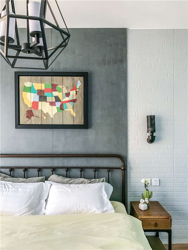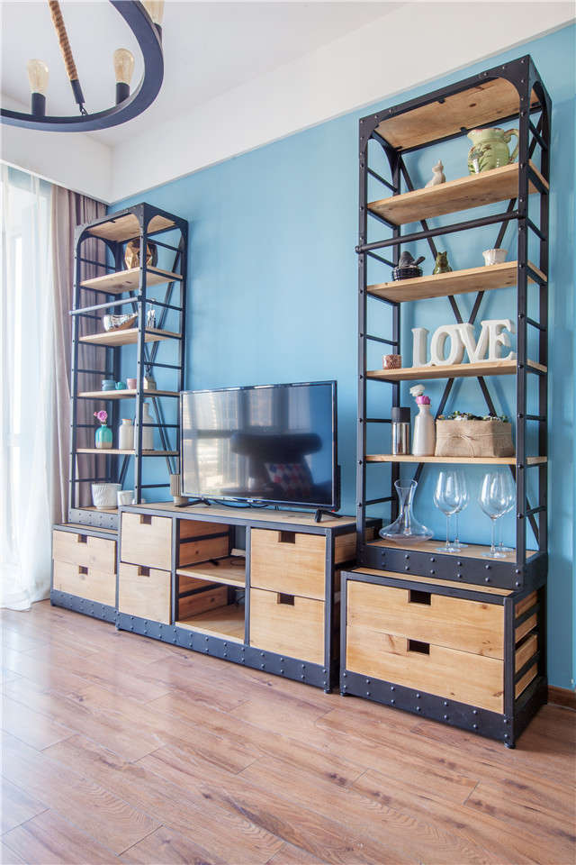 “这套房子的格局划分很合理,不需要进行大动干戈地硬装改造,只需改造局部和重新软装就能让整个空间重现焕发活力。”客厅和餐厅是联通在一起的,在视觉上很开阔,为了划分这两个功能区设计师用色彩进行了区分。沙发区用白色墙砖纹理做了一面主题墙,就餐区则用蓝色涂料进行粉刷,两个区域轻松实现了功能划分。家具的选择跨度比较大,从工业风、复古风到原木家具混搭组合,让整个空间散发出怀旧又摩登的工业气息。