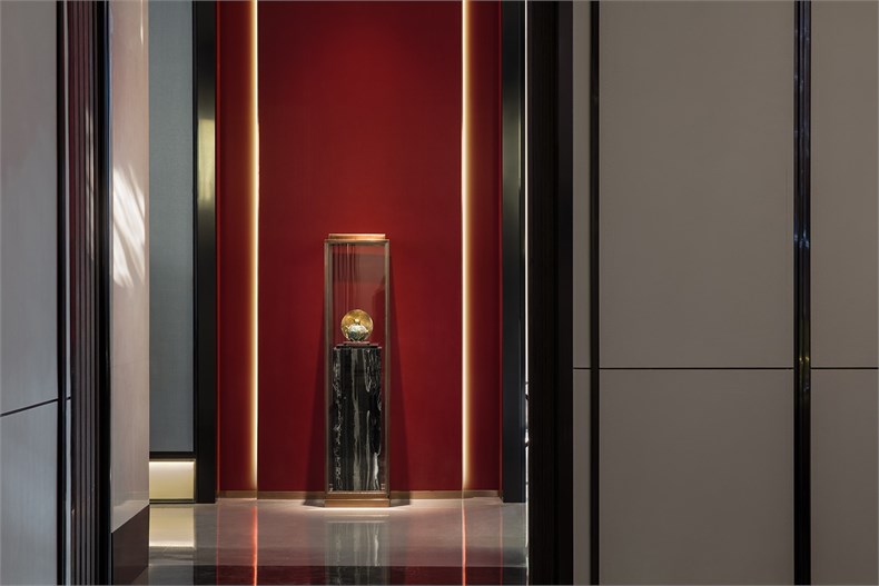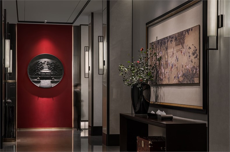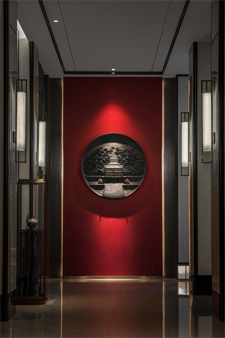 走廊上展示的雕塑艺术品为故宫俯视图,其圆形浮雕威严、肃穆、排列有秩,为皇室的象征,也体现金茂府的极臻的品质。
