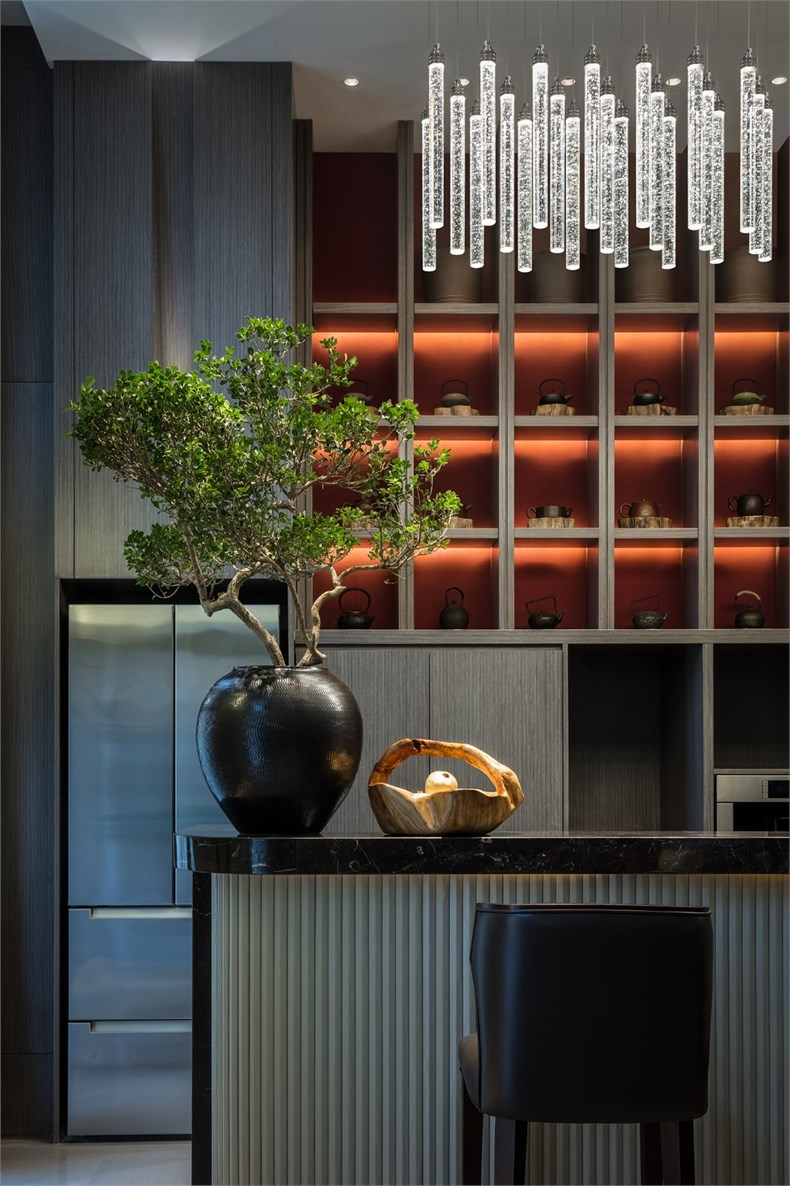 水吧区垂直悬挂水晶质感的圆柱形灯管,结合陶罐、木质的果篮,演绎一场传统与现代的对话,自然与人文的交流。