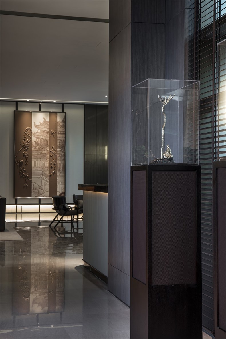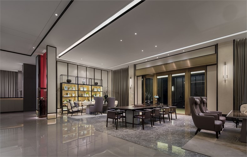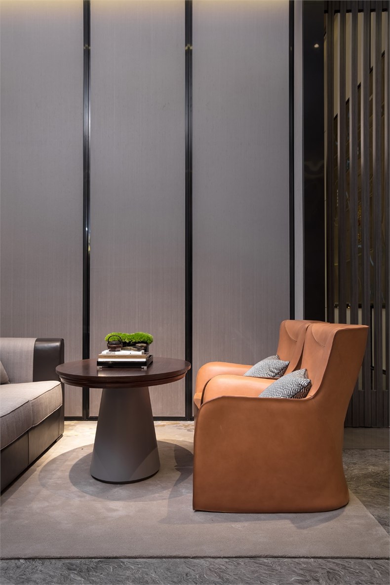 深洽区引入“客户会”概念,服务于高端客群的交流,大茶桌与洽谈桌多种使用功能互相辅助、转换,中间的长茶台的摆放,既保证了两组洽谈区的私密性,又可随时品茗。