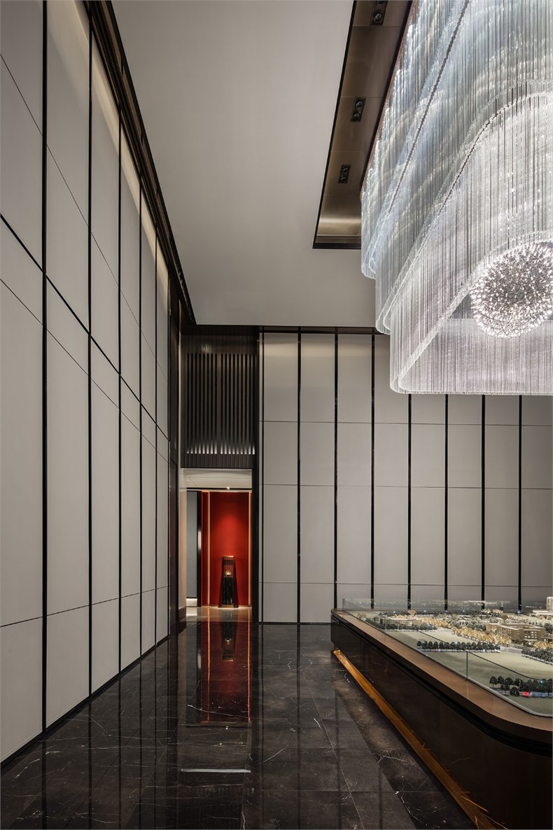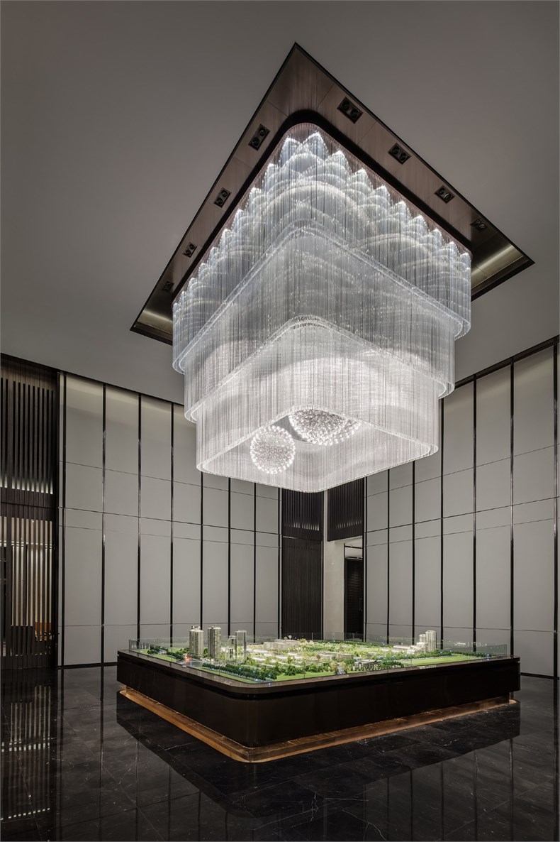 沙盘展示区灯具如瀑布般一泻而下,恰如其分的平衡而有秩序,一如“中正”的概念,层层影漫,大大小小的圆形艺术灯,又仿佛硕果累累的石榴,以小见大,处处体现中国哲学的精华。