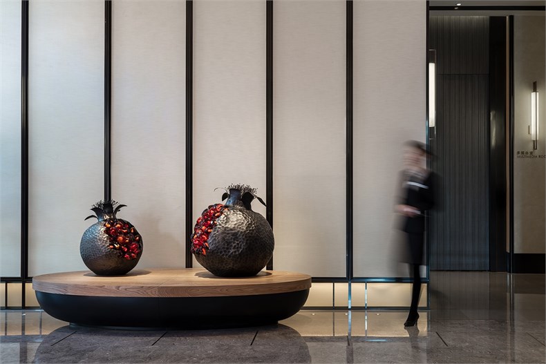 四个端景摆放了石榴型景泰蓝艺术品,造型古朴传统,颜色图案富于变化,不仅象征中国优秀的传统技艺,其上镶嵌的图案为寓意多子多福百子图,于细节处体现设计师的用心之致。