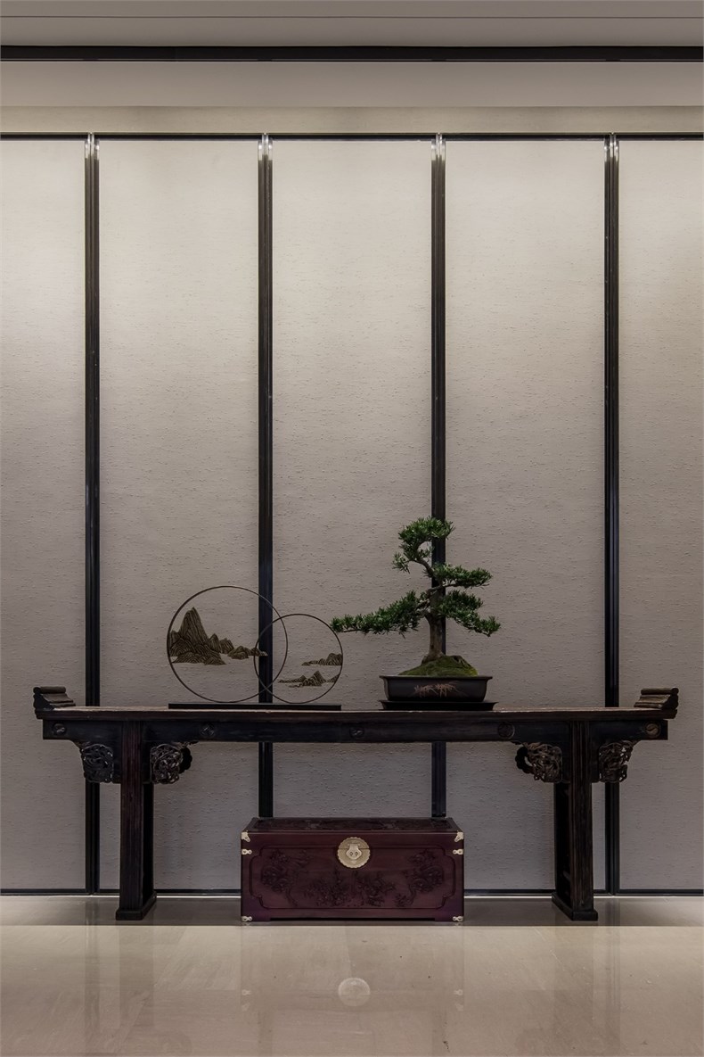 历经岁月洗礼的老条案,与一花一景互相诉说着悠远的历史,依靠素净雅致的墙面,自成一景,用自身显明“传统”亦是传承,不可撼动的敬畏感由此而来。