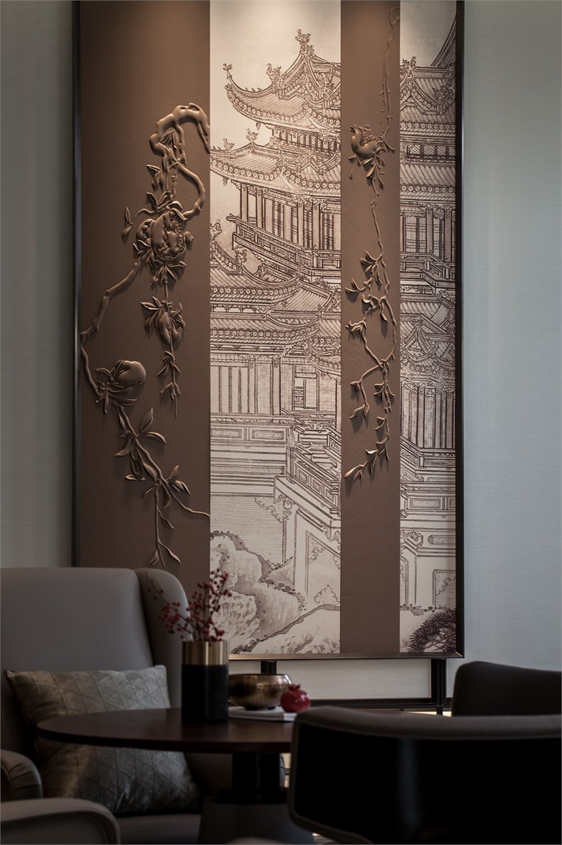 步入浅谈区,墙上艺术挂画抢先映入眼帘,错综复杂的石榴枝,奋力成长,盘绕在楼阁之上,微微凸起的造型将石榴枝刻画的格外生动,柔软的皮雕画与硬朗的铜板画交相呼应。