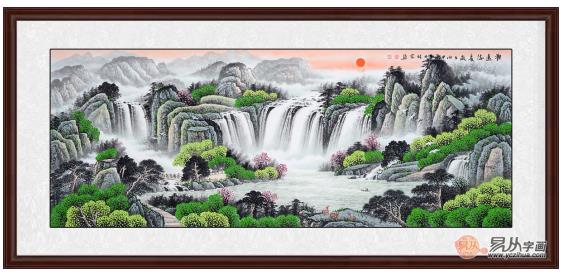 大气的瀑布飞流而下,给人感遭到“飞流曲下三千尺”的那种宏伟,瀑布激起云气,给人一种如梦如幻的仙境的感受,绿树红花,旭日东升,构图上以环抱之姿寄寓平和,将“山川环抱,藏风聚气”的地舆元素无机融入,其前景宽阔送祥享福,左有招财树,左有挡灾树,整幅做品青山绿水间展示平和完竣、招财聚富的深远意境。画家精妙的正在山脚下安插小鹿,祥鹤起飞,让做品中插手“福禄寿喜财:的风水元素,这幅山山川画挂正在办公室,意境广宽,旺财转运,档次高,给脚你体面。