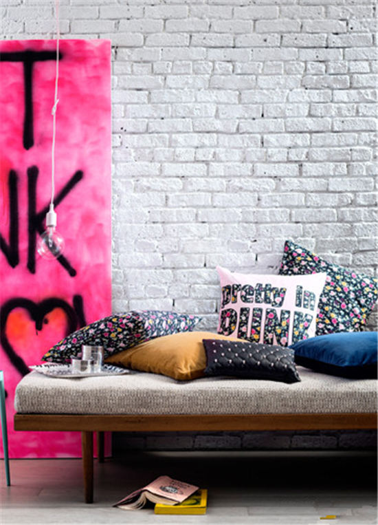 靠包多变的色彩和纹饰能投合分歧的家居气概,正在简约、色调单一的白砖墙下、,挂画的存正在令另视觉腾跃,英文字母等浓艳花色靠包表现前卫取活力。靠包不再做为副角呈现正在这里,而是主要的软品,是家中的点睛之物。