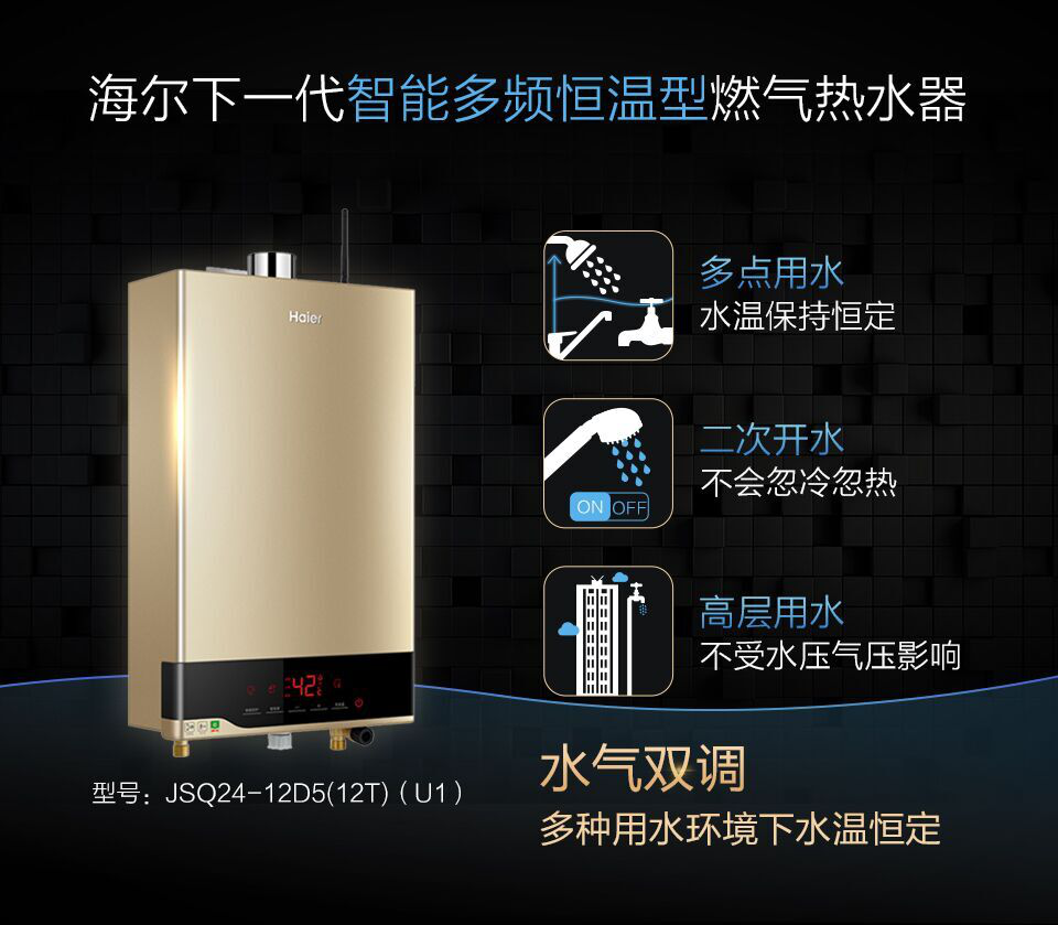 以海尔下一代WI-FI智能安防型燃气热水器(JSQ24-12D5)为例,它配有专利智能风压系统,可及时室外风压,防止大风倒灌,确保燃气热水器正在大风气候平安不变工做。此外,它还通过水气双调功能,使水温精度达到±0.5℃。无论多点用水、二次开水仍是高层高峰时段用水,热水器输出的热水水温都不受水流、水压影响,温度不变、水流充沛。