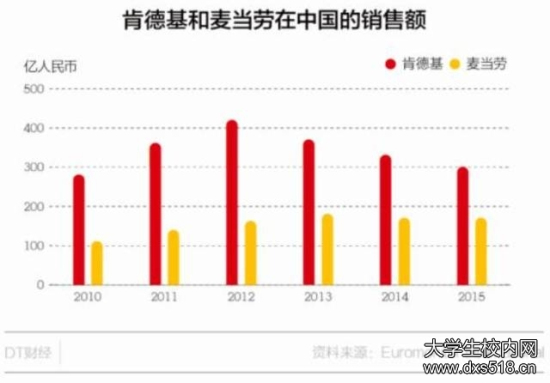 据上图,2010-2015年,肯德基正在中国的发卖额仍是远超麦当劳,约是麦当劳的两倍,然而发卖额的差距自2012年之后逐年缩小。