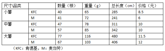 据上表能够看出,麦当劳的小薯只需6元。一样的价钱,麦当劳的中薯比肯德基做的更,数量多了10根,分量和长度都大于肯德基。而肯德基的大薯连起来有4.8米,无论是价钱、数量、仍是分量、总长度方面都比麦当劳有压服性的劣势。