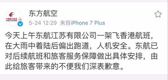东航随后做出回应:今天上午东航江苏无限公司一架飞喷鼻港航班,正在大雨中着陆后偏出跑道,人机平安。东航已对后续航班和搭客办事保障做出具体放置,由此给搭客带来的未便我们深表歉意。