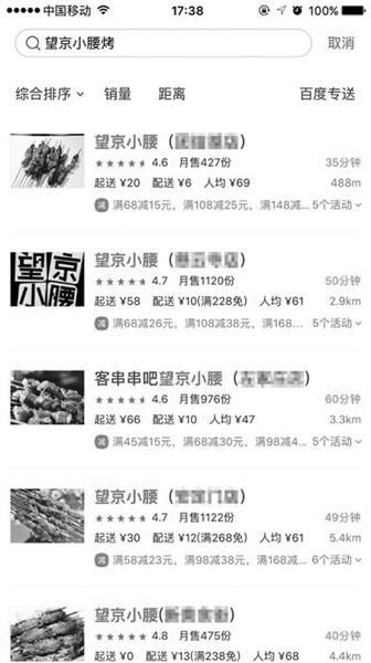 北青报记者正在饿了么、美团外卖和百度外卖平台检索“望京小腰”,发觉有跨越15家店利用“‘望京小腰’(××分店)”的名称,此中,多名商家还利用了黑底黄框印有“望京小腰”字样的图片,做为招派司片。
