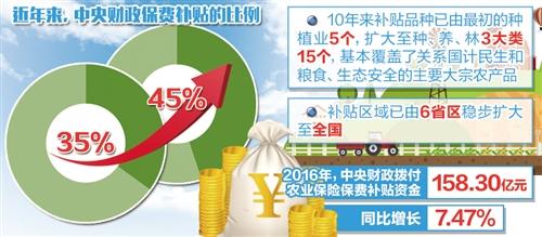 取地方一号文件相联的,还有从2007年地方财务全面启动政策性农业安全试点以来,财务补助的比年添加。数据显示,近年来,地方财务保费补助的比例从35%逐渐提高到45%,10年来补助品种已由最后的种植业5个,扩大至种、养、林3大类15个,根基笼盖了关系国计平易近生和粮食、生态平安的次要大农产物;补助区域已由6省区稳步扩大至全国。2016年,地方财务拨付农业安全保费补助资金158.30亿元,同比增加7.47%,是2007年的7倍多。