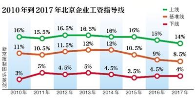 新京报讯 (记者吴为)昨日,市人社局发布了2017年企业工资指点线,职工平均工资增加的基准线为8.5%,上线为14%,下线为4%,各企业均可参照指点线调整职工工资程度。记者获悉,这是自2014年以来,持续第4年下调工资增加基准线尺度。