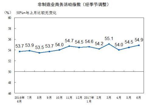 中国物流取采购结合会、国度统计局办事业查询拜访核心30日发布的2017年6月份中国非制制业商务指数显示,正在中国非制制业PMI各单项指数中,新订单、新出口订单、正在手订单、投入品价钱、发卖价钱、从业人员和营业预期指数环比有所上升,升幅正在0.1至1.3个百分点之间;供应商配送时间指数环比持平;存货指数环比下降0.2个百分点。
