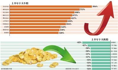 就个股而言,涨幅榜取跌幅榜的股票“两沉天”。Wind资讯数据显示,涨幅榜前十均为新上市股票,涨幅均跨越5倍。上半年,至纯科技以884%的涨幅位居首位。