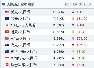 中国人平易近银行授权中国外汇买卖核心发布,2017年6月30日银行间外汇市场人平易近币汇率两头价为:1美元对人平易近币6.7744元,1欧元对人平易近币7.7496元,100日元对人平易近币6.0485元,1港元对人平易近币0.86792元,1英镑对人平易近币8.8144元,1元对人平易近币5.2099元,1元对人平易近币4.9569元,1新加坡元对人平易近币4.9135元,1法郎对人平易近币7.0888元,1元对人平易近币5.2144元,人平易近币1元对0.63376马来西亚林吉特,人平易近币1元对8.7565俄罗斯卢布,人平易近币1元对1.9200南非兰特,人平易近币1元对168.75韩元,人平易近币1元对0.54215阿联酋迪拉姆,人平易近币1元对0.55356沙特里亚尔,人平易近币1元对39.9731匈牙利福林,人平易近币1元对0.54733波兰兹罗提,人平易近币1元对0.9596丹麦克朗,人平易近币1元对1.2485克朗,人平易近币1元对1.2368挪威克朗,人平易近币1元对0.52037土耳其里拉,人平易近币1元对2.6626墨西哥比索。