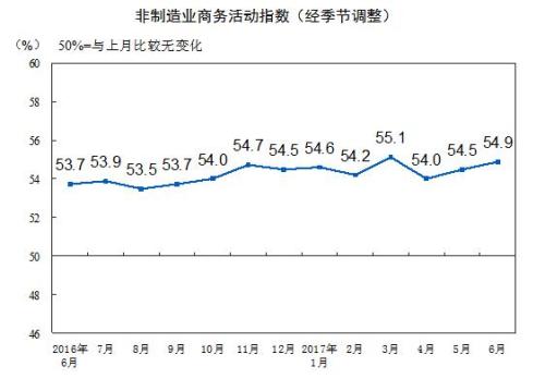 中新网6月30日电 国度统计局网坐发布动静,2017年6月份,中国非制制业商务指数为54.9%,高于上月0.4个百分点,持续两个月上升,非制制业延续稳中有升的扩张态势。