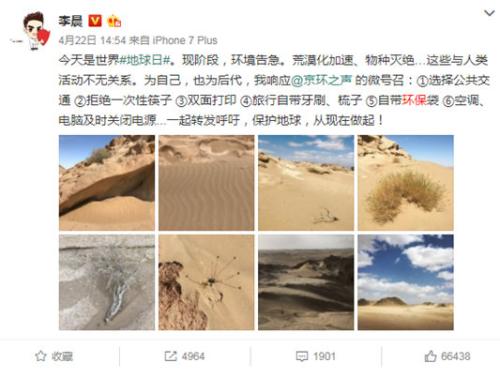 不只如斯,去世界地球日当天,李晨还积极响应京环之声的微号召,呼吁公家地球,还正在微博上PO出了环保宣言: