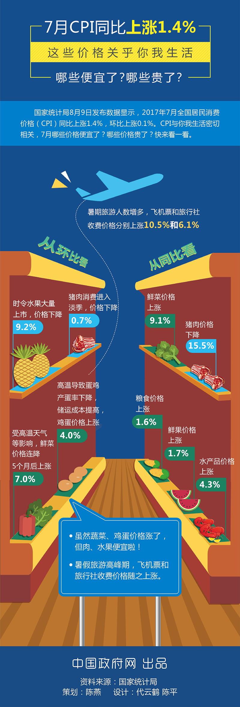 国度统计局8月9日发布数据显示,2017年7月全国居平易近消费价钱(CPI)同比上涨1.4% ,环比上涨0.1%。CPI取你我糊口亲近相关,7月哪些价钱廉价了?哪些价钱贵了?快来看一看。