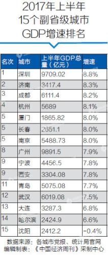 跟着各省份2017年上半年经济数据的出炉,15个副省级城市的上半年经济成就单也连续发布。15个副省级城市上半年经济总量若何?经济增速有何变化?表现出如何的区域经济特征?《中国经济周刊》记者对15个副省级城市上半年经济数据梳理后发觉,有12个城市经济增速高于全国6.9%的程度,南方城市经济增速全体高于北方城市,此中深圳以8.8%的经济增速领跑,沈阳以-0.4%的增速排名垫底。