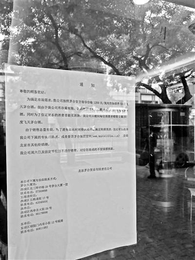今天半夜,北青报记者来到位于西单北大街的贵州茅台平价酒指定商铺实地看望,走到门口送面看见商铺玻璃大门上贴着一份给顾客的通知书,写着:“为满脚市场需求,我公司按照茅台指点价钱1299元/瓶向市场发卖53度茅台酒。但因为我公司库存量无限,因而每天只能发卖18瓶53度茅台酒。同时为了包管更多的消费者能买到酒,我公司只能向每位消费者发卖2瓶53度茅台酒。别的,我公司周六日及节假日不进行发卖。”