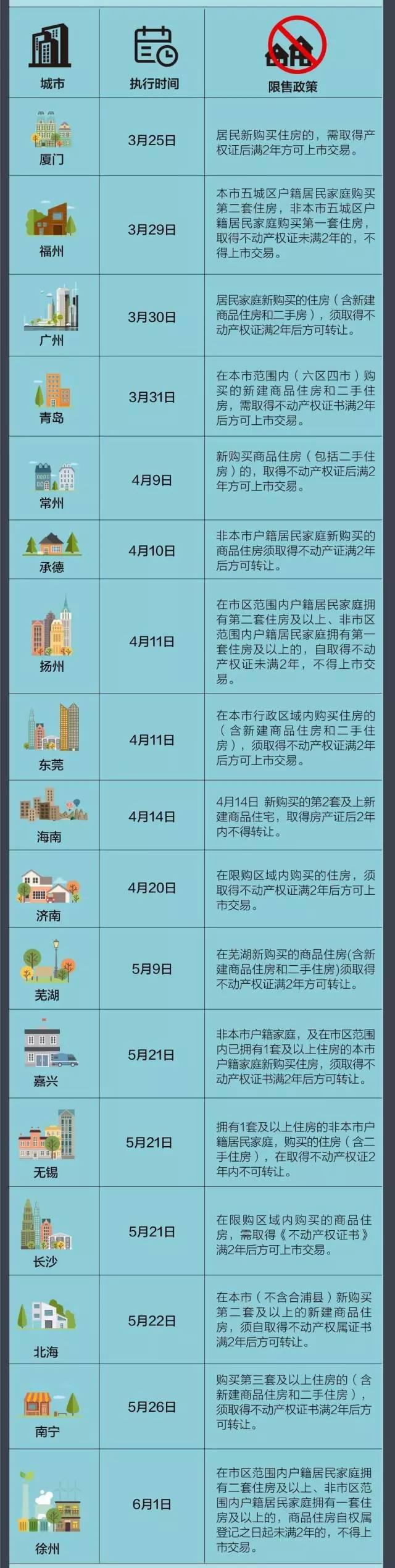 3月24日,厦门率先出台限售政策,此后多地效仿,限售城市从一二线城市向三四线城市延伸。