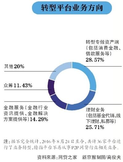 除了基于苦守网贷营业的集团化转型和“抱团取暖”,也有平台发觉本人走的子不合错误,选择剥离网贷营业。网贷之家的统计显示,2016年8月24日至今,共36家平台进行营业转型,不再处置P2P网贷行业相关营业,包罗专注资产端(包罗消费金融、告贷办事等)、理财营业(包罗基金代销、线下理财、私募等)、众筹、金融办事(金融行业资讯供给、金融处理方案供给等)。而转型专做资产端的比例最高,达到了28.57%,其次为理财营业,占比为25.71%,金融办事占比14.29%。