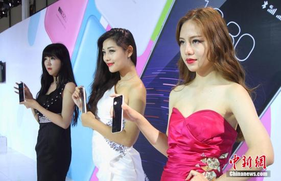 材料图:2015年,正在南京举办的一场手机大会上,模特们正在展现各类新品手机。李珂 摄
