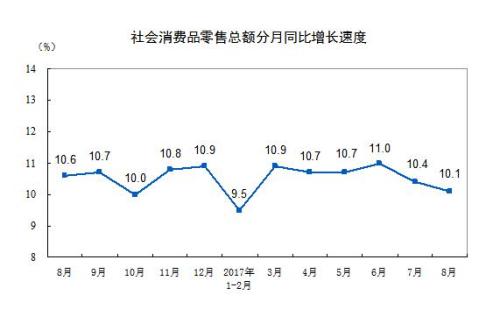 中新网9月14日电 据国度统计局网坐动静,2017年8月份,社会消费品零售总额30330亿元,同比表面增加10.1%(扣除价钱要素现实增加8.9%,以下除特殊申明外均为表面增加)。此中,限额以上单元消费品零售额13229亿元,增加7.5%。