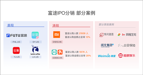 实际上,在“富途安逸”被推向公众之前,自2016年起富途就已经在为企业提供IPO分销服务,且企业服务是富途证券重要的客户来源之一。富途安逸IPO分销服务,主要面向富途牛牛平台上近600万的港美股投资者,通过社区活动、股票百科、企业主页以及企业视频解读等方式解读IPO企业,帮助企业与投资者形成良好互动。目前,富途已经为多家新经济企业提供IPO分销服务,包括港股市场的小米、美团点评、华兴资本、阅文集团等知名企业,以及美股市场的如涵、新氧、云集、瑞幸等。