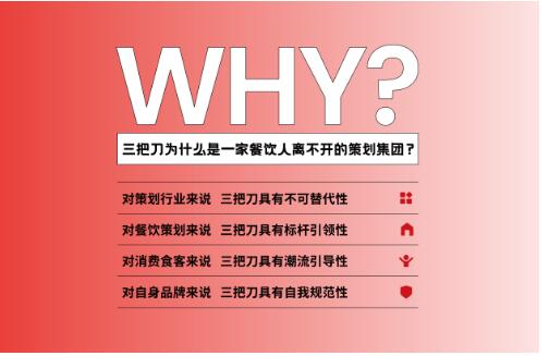 三把刀,是一家专门做餐饮策划的公司。正所谓术业有专攻,三把刀多年以来一直专注于餐饮品牌营销,团队积累了足够的实力和经验,足以应对各种不同的餐饮营销策划。三把刀总部位于重庆,在成都、上海均有分部,已经实现了全国连锁。品牌成立至今,业务已涉足中国六大地区及韩国、美国等多个地区,无论你的品牌在何地,都可以享受到最方便快捷的策划服务。