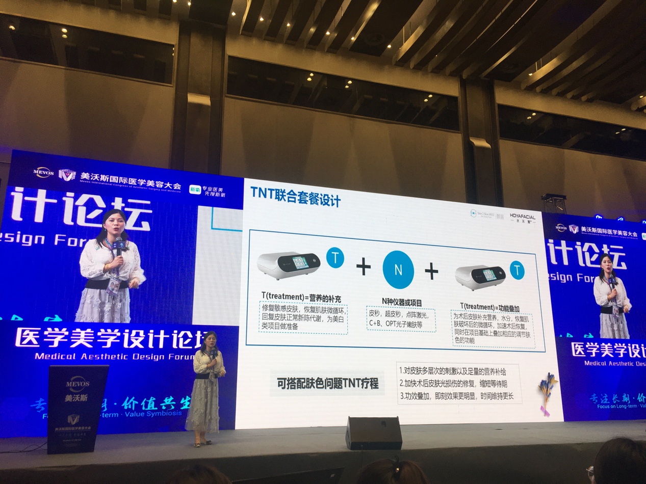 在《医学美学设计论坛》,上海港丽医美院长—郁培颖讲师带来《成分党的2.0时代:美塑产品如何激起千层浪?》的高能讲解。郁培颖讲师在大会现场表示:作为夏季防晒水光——颜层水光是根据肌肤晒前预防以及晒中晒后修复等问题来进行研发生产。以“「营养+功能」为产品理念的三款水禾雅水光”针对不同肤质能产生不同疗效,同时结合TNT进行联合治疗,达到1+1>2的术后效果。
